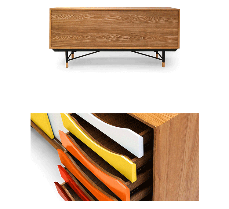 color theory sideboard(色彩理论餐边柜)是设计师Juhl Finn设计的,Kardiel公司制作的经典实木家具,1940年,他设计的第一张座椅、也是最经典的作品——《鹈鹕椅》(Pelican Chair),目前为纽约现代艺术博物馆 MOMA 所珍藏。彩色的滑动门与托盘餐具柜是1955年由Juhl Finn为BOVIRKE设计的。)是Kardiel公司制作的经典实木家具。复古但永不过时的木炭是和橙色,结合美国核桃开创了20中世纪六十年代中现代主义的时代。在现代主义的存储家具上, Finn Juhl和 Arne Vodder 最先尝试胶木和天然木的组合运用。这是大胆的创新,他们结合传统的新鲜的新兴技术与现代主义的概念。他们通过这些色彩绚烂的产品所实现的是令人印象深刻的比例的平衡。制作采用精选MDF板基材胡桃木皮或水曲柳贴面、五金脚架、环保油漆喷涂、做工精湛。颜色元素的使用反映了他迷恋歌德的著名彩色圈,颜色处于和谐的凝聚力。