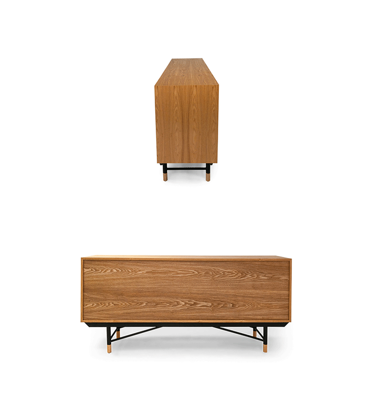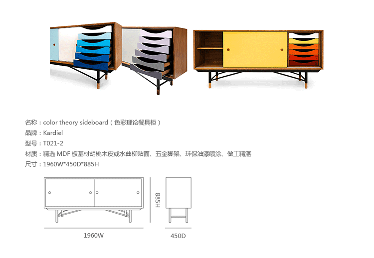 color theory sideboard(色彩理论餐边柜)是设计师Juhl Finn设计的,Kardiel公司制作的经典实木家具,1940年,他设计的第一张座椅、也是最经典的作品——《鹈鹕椅》(Pelican Chair),目前为纽约现代艺术博物馆 MOMA 所珍藏。彩色的滑动门与托盘餐具柜是1955年由Juhl Finn为BOVIRKE设计的。)是Kardiel公司制作的经典实木家具。复古但永不过时的木炭是和橙色,结合美国核桃开创了20中世纪六十年代中现代主义的时代。在现代主义的存储家具上, Finn Juhl和 Arne Vodder 最先尝试胶木和天然木的组合运用。这是大胆的创新,他们结合传统的新鲜的新兴技术与现代主义的概念。他们通过这些色彩绚烂的产品所实现的是令人印象深刻的比例的平衡。制作采用精选MDF板基材胡桃木皮或水曲柳贴面、五金脚架、环保油漆喷涂、做工精湛。颜色元素的使用反映了他迷恋歌德的著名彩色圈,颜色处于和谐的凝聚力。