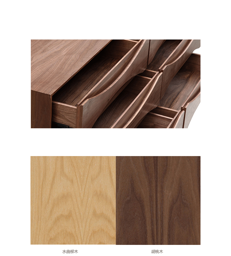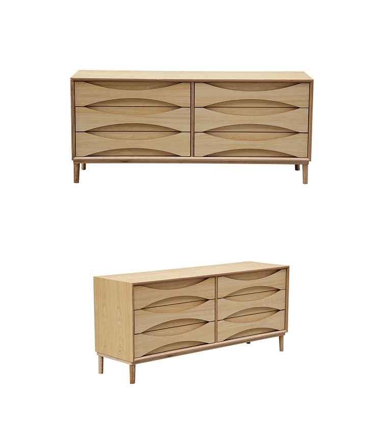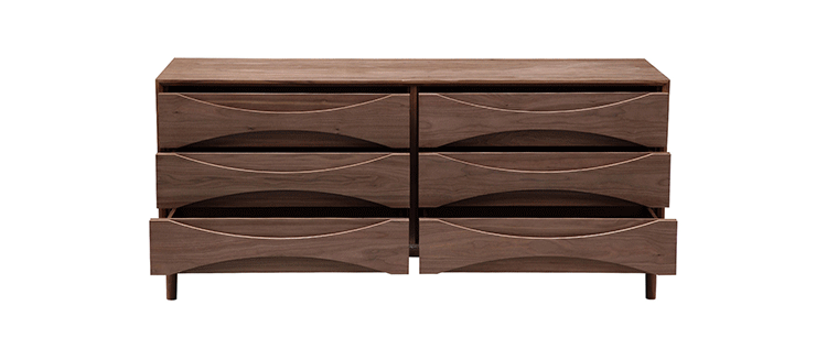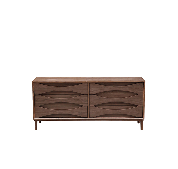 arne vodder retro lowboy dresser(arne vodder复古短脚衣橱梳妆台)是Kardiel公司制作的经典实木家具,具有世纪中期的现代风格,6个滑动式抽屉通过精心制作,提供足够的空间存放衣物或其他物品。在现代主义的存储家具上, Finn Juhl和 Arne Vodder 最先尝试胶木和天然木的组合运用。这是大胆的创新,他们结合传统的新鲜的新兴技术与现代主义的概念。制作采用精选MDF板基材胡桃木或水曲柳木皮贴面、胡桃实木或水曲柳实木脚架、环保油漆喷涂、做工精湛。