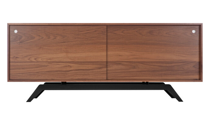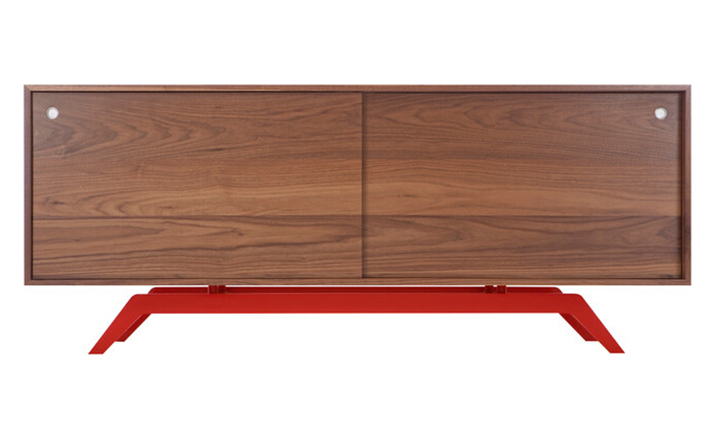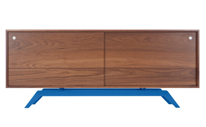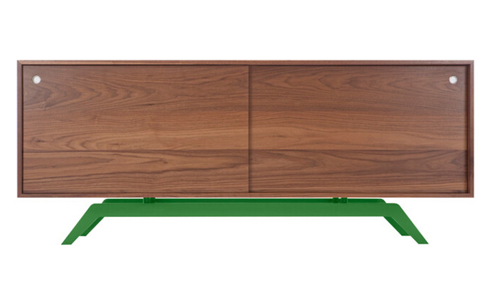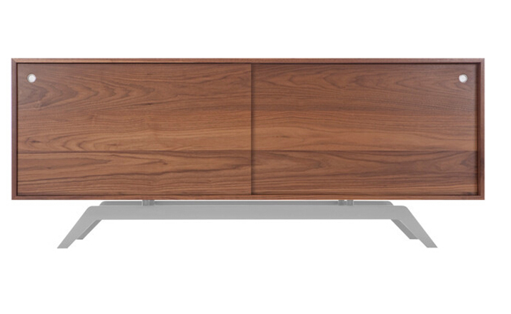 "The sleek base is laser cut and powder coated in one of 6 color options.The box is handcrafted of solid wood with reinforced mitered joints allowing the wood grain to wrap around the entire piece.Behind the smooth sliding doors are adjustable shelves and wire passages that make it a simple and flexible place for all of your media needs,wired and unwired."