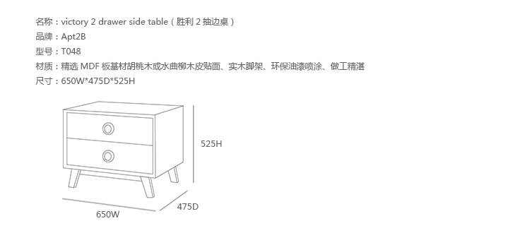 victory 2 drawer side table(胜利2抽边桌)是Apt2B公司设计的经典实木家具,设计简单但绝对的华丽,配置2个平滑抽屉,提供许多存储空间,可以存储方便您存储自己的物品,制作采用精选MDF板基材胡桃木或水曲柳木皮贴面、实木脚架、环保油漆喷涂、做工精湛。