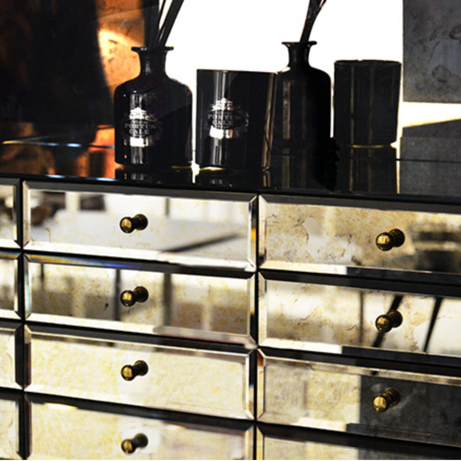 1088木森林的多样性和完成三角形:银叶,金箔,彩色涂料,十个不同类型的木材叶(乌木单板、非洲胡桃木单板、zebrano单板,杨树单板,黑黄檀。 室内:两扇门在里面完成钻石绗缝蓝色丝绸织物开放九个抽屉用金旋钮和内阁空间所有年龄在镜子里完成。 基础:抛光黄铜