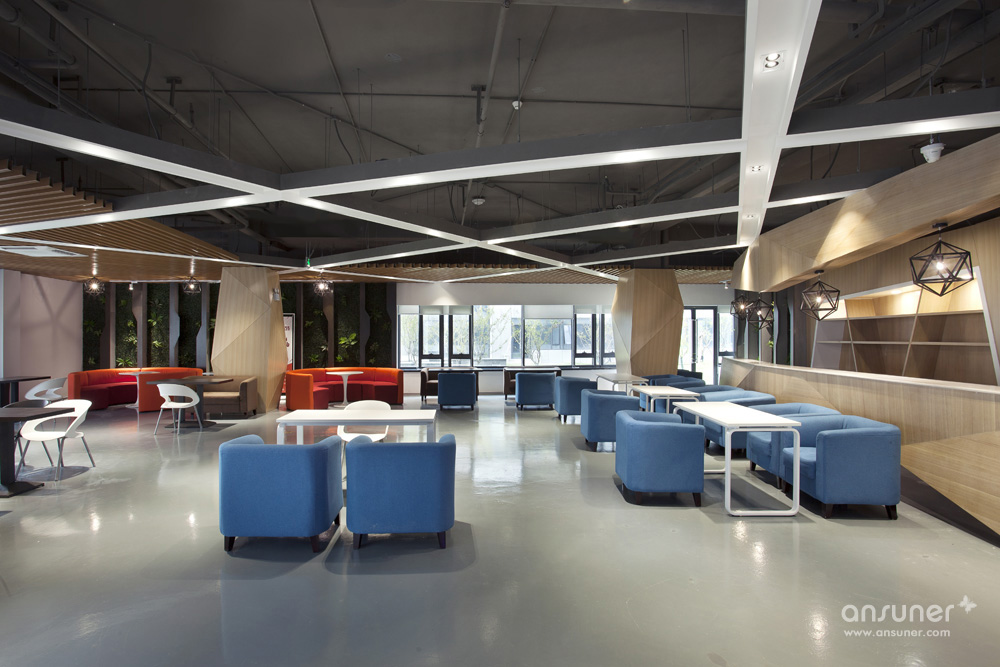 整个中庭为本案的亮点。设计师利用建筑的结构优点,并为了更好地展示出每层的特色,采用了腾讯文化中的几个主色调,不同的色调代表着每层的空间色彩效果。为了使中庭的空间感更为突出并结合设计理念中的造型元素,每层楼板外立面及柱体,都运用了立体式折线的效果。从中庭对应的一楼休闲区也设计了三组采用地球轴线组合而成的有趣的休闲讨论区,既有开放的效果,又有一定的分割隐私作用。