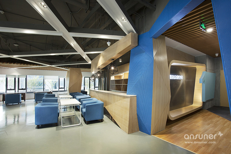 从前台到背景墙及天花的延伸,整个前厅及展厅运用了折纸的造型元素。主色调采用了腾讯的科技蓝,更为体现现代科技质感。展厅通往咖啡厅的休闲区也以折纸的原理打造成既独立又开放的讨论屋,使休闲区更为有趣生动。展厅的天花采用喷绘软膜,展现出星空的神秘质感,也体现出展厅的科技视觉效果。