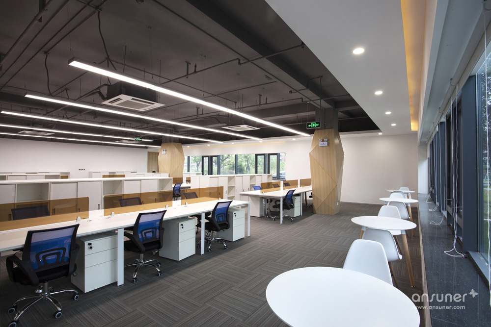 在一楼的沿窗休闲讨论区里,整面墙采用绿植装饰,与室外的绿化相呼应。咖啡厅的效果以简洁为主,地面采用了耐磨及耐清洁的灰色调地坪漆,家具及材料的选择也以暗色调为主,以迎合咖啡的色调。办公区内的茶水区是员工讨论休闲的区域,整个色调的运用营造出温馨放松的空间氛围。