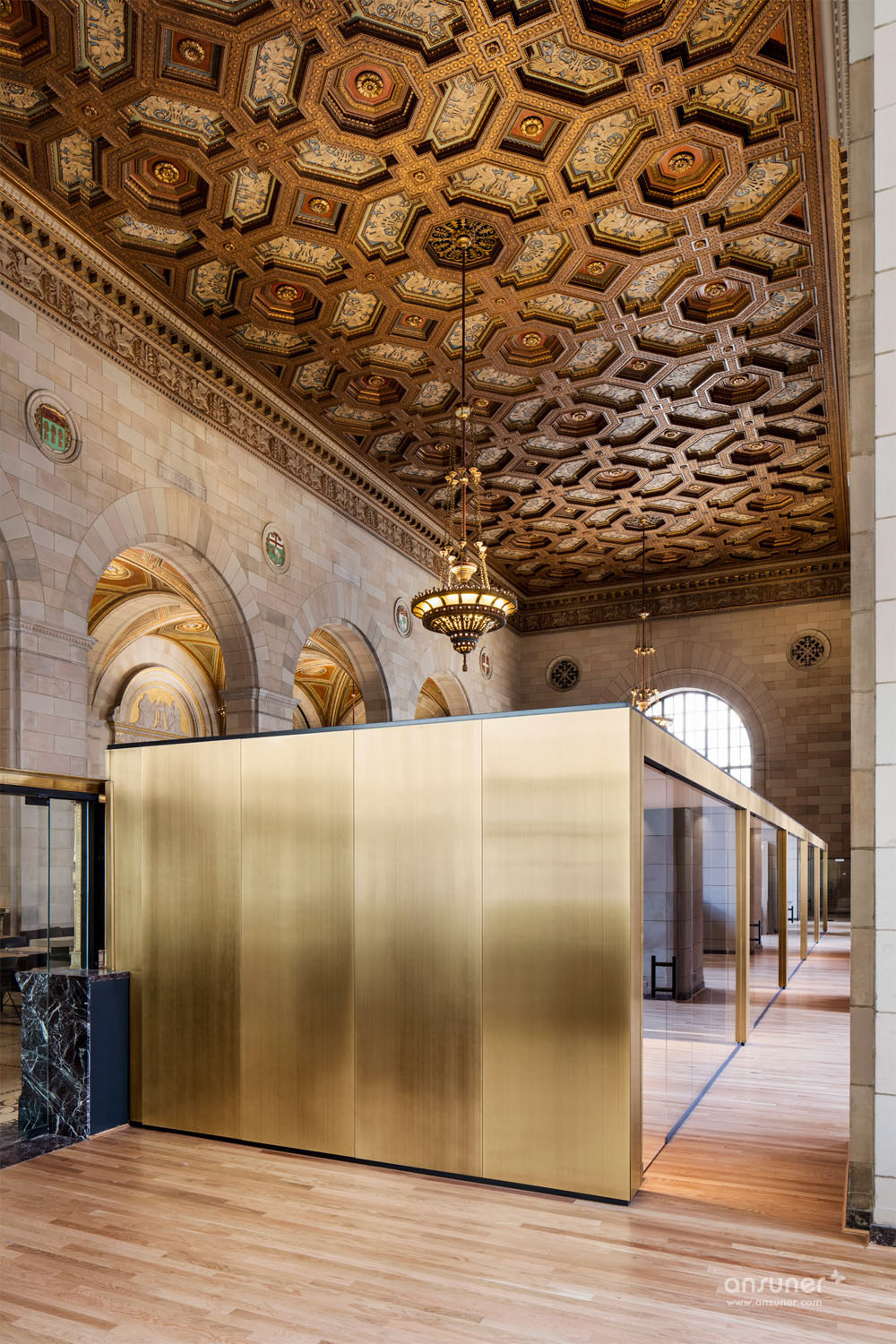 一字排开的会议室,内部隔断采用精美的拉丝镀铜钢板制作,以此与华丽的石膏天花构造形成对比和色彩上的统一。这里的会议室面向大众开放,任何人都可以预定使用。正面透明的玻璃设计可以随时观望会议室的使用状况。