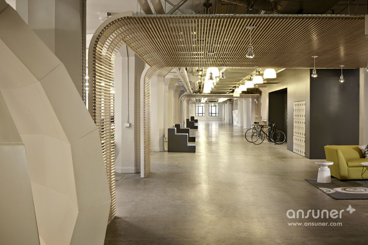 Runway社区,新兴创业者的孵化基地。设计的挑战在于如何将其打造成一个热情且具特色的办公空间,使其在众多同行中脱颖而出。设计团队以前卫的设计概念将这座位于Twitter大楼占地30,000平方英尺的孵化基地打造成一个时尚的社区,而非仅用以工作的办公场所。刚起步的创业者可租用一套桌椅或400平方英尺的区域空间。