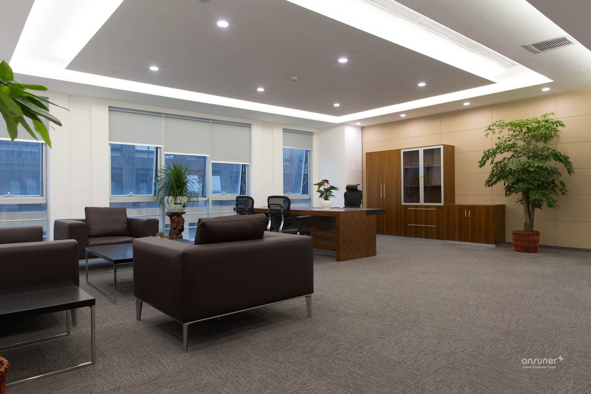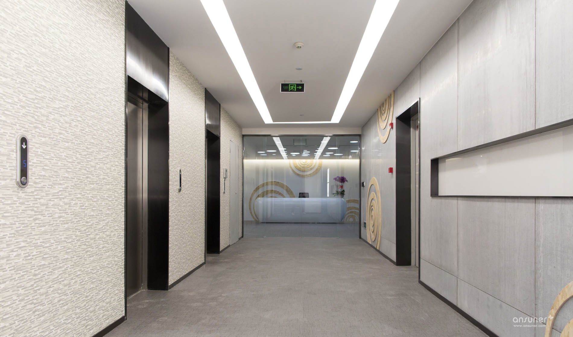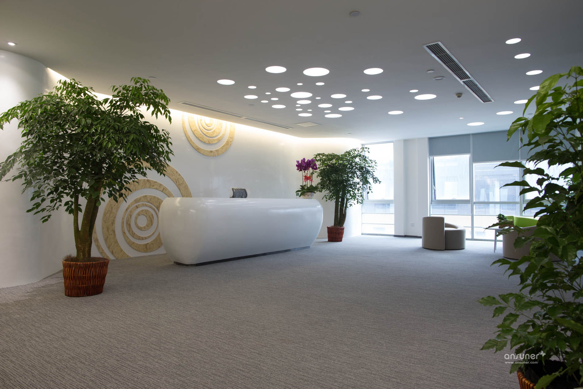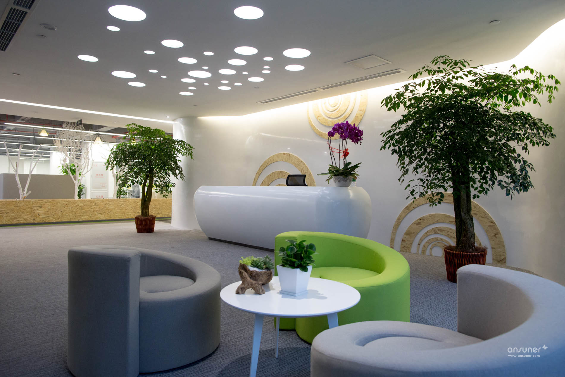 接待台后面的装饰墙上镶嵌着由小及大的圆环,彷如那神秘幽深的银河,是探索的方向。类比的“星空”、“银河”,在形式上做到了既不直白同时又能反映企业相应的特点,增强了对于爱游戏官方入口的体现。