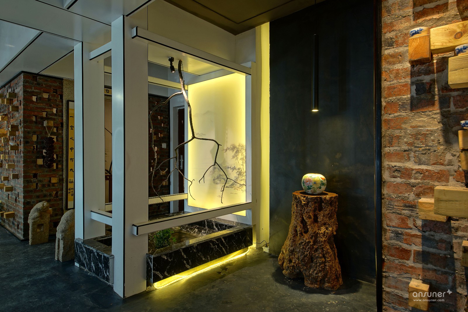钢筋水泥的生活是城市的写照,泥巴、瓦片、木头是桃园生活的表象。在都市营造诗意的栖居,让内心宁静、自然,是本案设计的初衷。