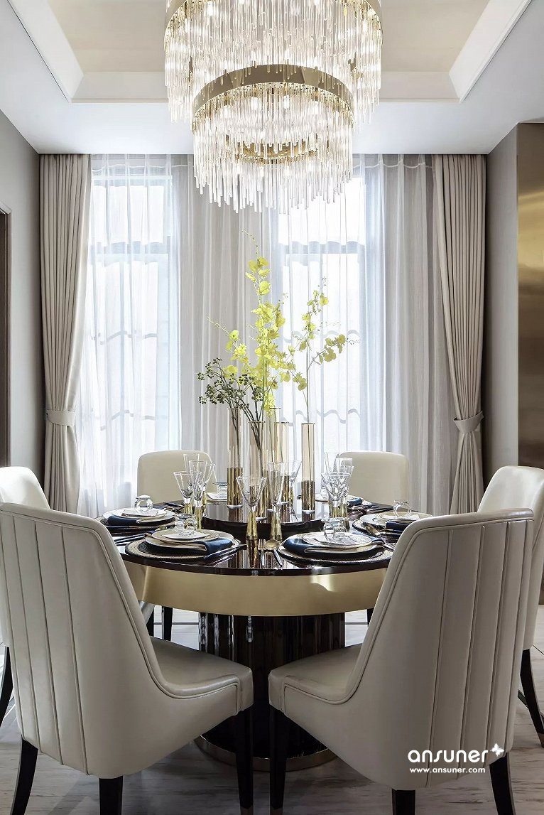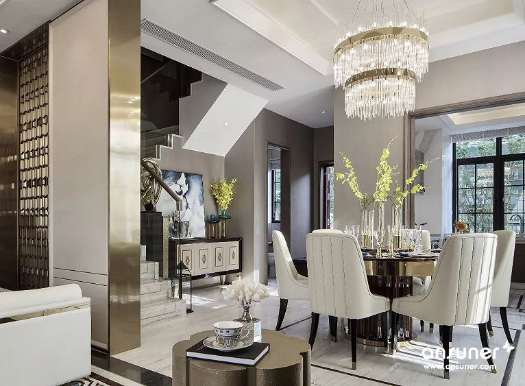 客厅整体空间为浅色系,线条简洁硬朗,象牙白的背景色,奠定了空间低调的质感、优雅的基调。设计师采用大量高级皮质材料,巧妙搭配自然质感的石材以及金属元素,璀璨的金色和几何经典,给予色彩最大的礼赞。流光溢彩的水晶吊灯尽显奢华,恰如一个浪漫的音符,赋予空间生动轻灵的魅力。