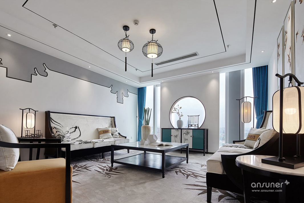 空间造型与整体结构与传统文化风水学相符。“天圆地方”的空间结构暗合天人合一的传统文化精髓,天地互为感应,其中人被视为天地万物之灵,能够感通万物,最灵者也。前厅以“山”形为背景,地面设置“水”景,意喻有山有水,藏风聚气,山水相通,气运不绝。