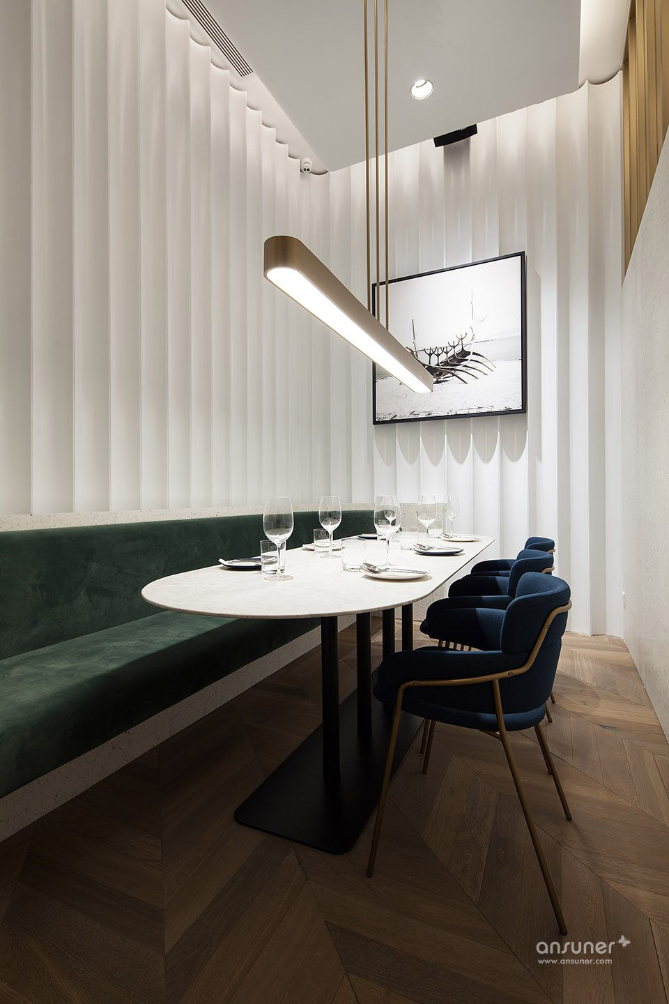 将这些自然元素同时搭配运用,更显颓废低调的处理,却无疑将整体氛围营造出了具有现代感的审美体验。例如,除了具有米黄、冷灰、浅棕等中性色调的长沙发外,舒适的吧区沙发椅使用了翠绿和午夜蓝的奢华色调,暗示着空间在晚间的氛围变化。当夜幕降临时,GAGA Chef的酒吧休闲区将会从优雅的咖啡沙龙变身为适宜餐后饮品与鸡尾酒的亲密空间。