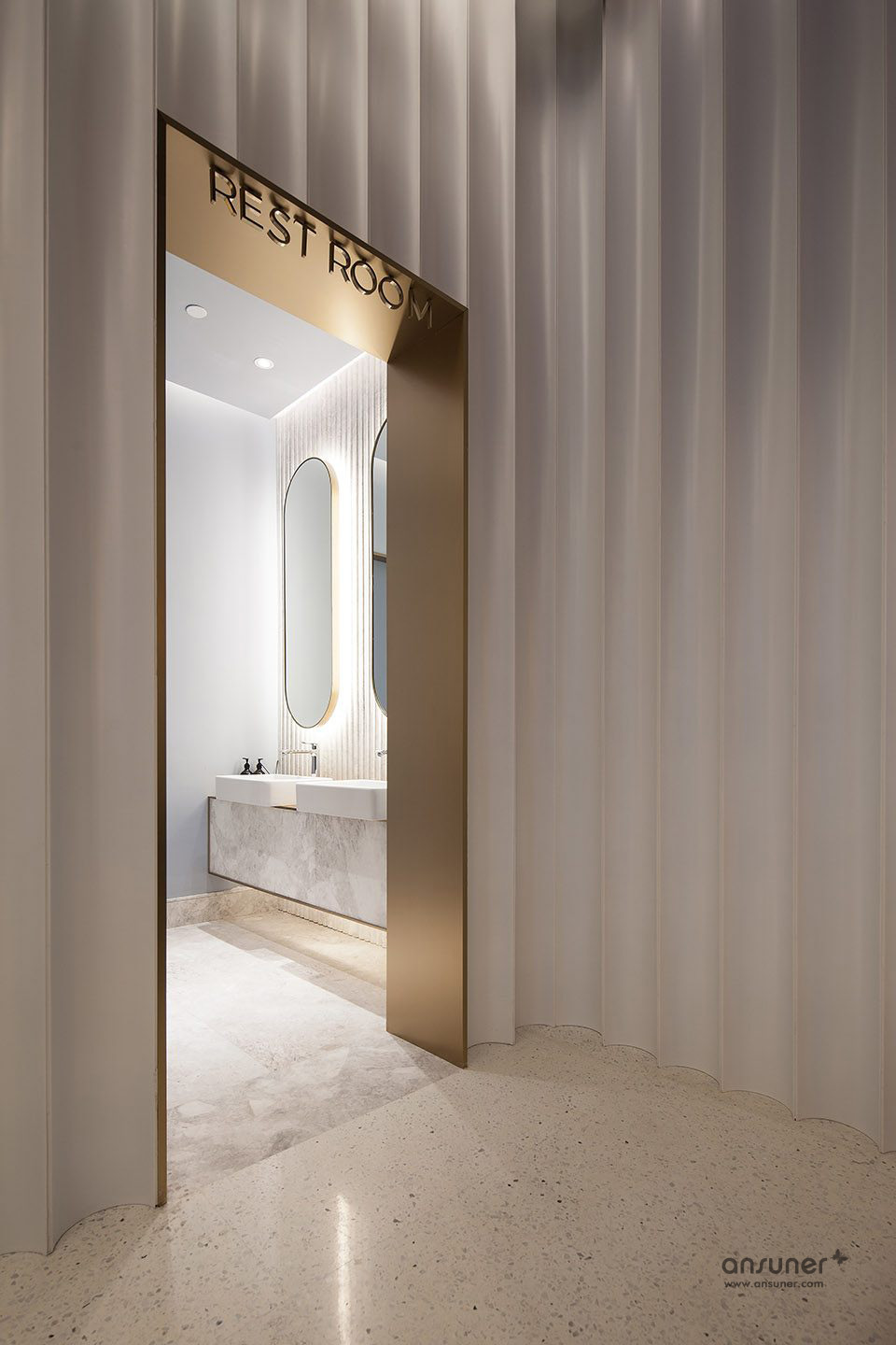 从门框到灯具的金色黄铜装饰,衬托出暖融慵懒与奢华的气氛。