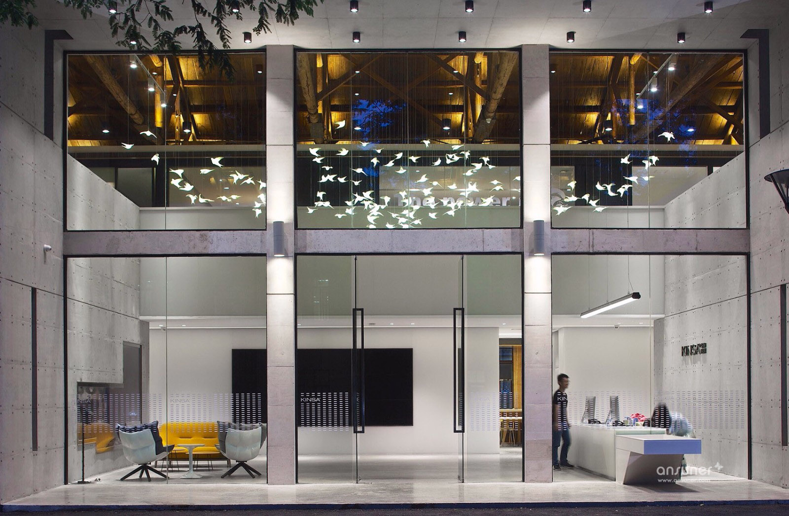 改造项目就是重新建立秩序的过程。在老空间置入微型建筑来重组空间,保持原有空间的质量,从整个建筑的外立面上置入三个空间口,主入口,咖啡厅入口,董事长办公室取景窗,重新组织建筑的空间秩序。为了强调主入口的等级,运用相对厚重的清水混凝土墙来强化。一层大堂挑空区域的材料,是像玉的润度的树脂装饰板,作为室内的主要墙面,组织主要交通空间,是连接一层各个功能空间的纽带。