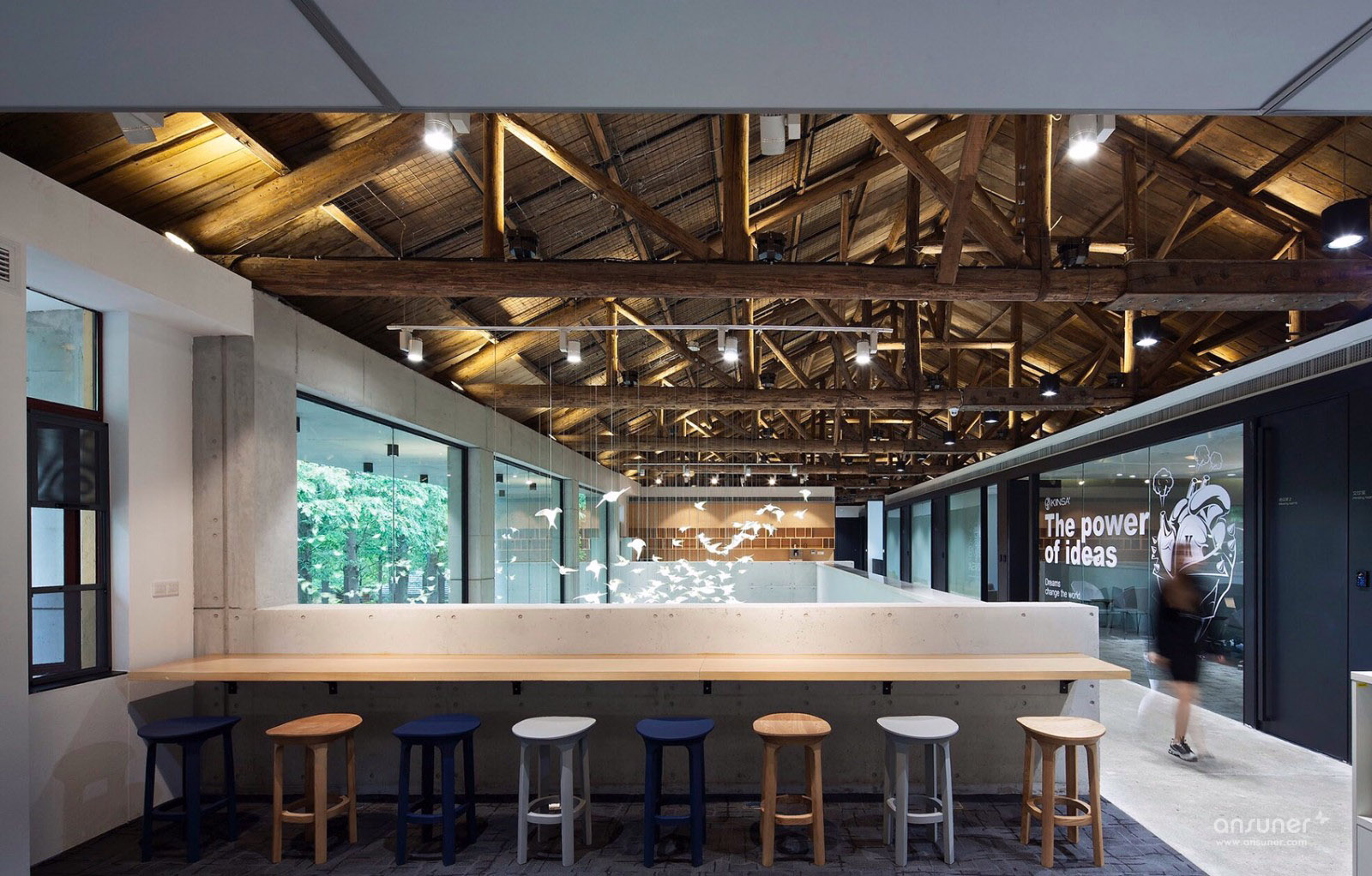 华泽传媒办公总部位于南京T80创意产业园,前身是民国时期中央政治学院,规划设计、建筑设计均由华盖建筑师事务所设计。民国时期西方文化对中国本土文化影响至深,南京作为民国政府首府更是文化交流甚密之地。T80创意产业园区就是典型的代表,传统木桁架坡屋顶与砖混结构结合,形成大跨度的教学使用的弹性空间。同时也是特殊历史时期,有志向的建筑师们对于建筑设计上的大胆尝试。