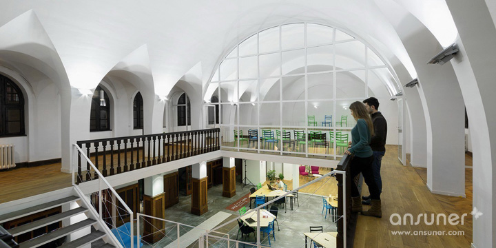 灵感的触动对于一个设计师,思考者来讲非常重要,IImpact Hub专业提供独特的系统资源、灵感和合作服务,帮助他们快速成长。教堂形的两层建筑大厅,分成三个双柱廊式拱券通道,并覆盖着大大的拱顶。因为功能需求,重新规划空间组织,一楼包括四间办公室、两间会议室、两个电话亭、厨房和厕所。所有这些功能都围绕中心共享工作空间而设。二层的平台,即可用作工作空间亦可在灿烂的夏日用作社交活动。