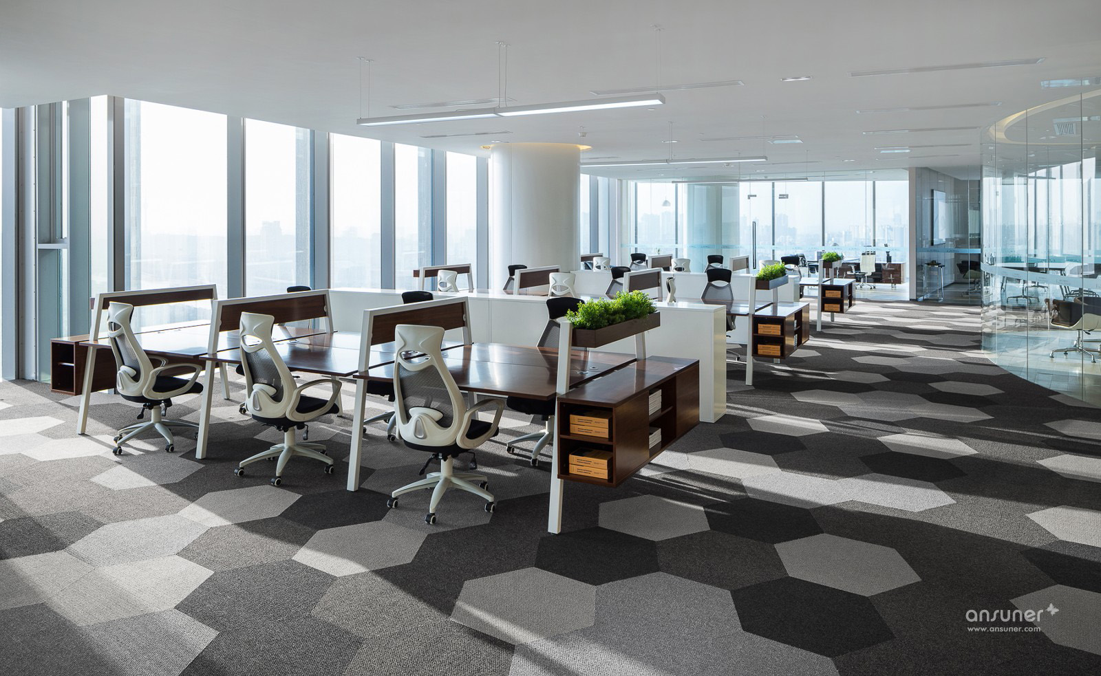 武汉越秀财富中心为华中地区位居第三的高楼,总高330米,地处武汉汉口核心地段,内环线西顶点,承武广,临汉江,居百年大道一中山大道之源。项目位于22楼的办公示 范间,为营造一个既开放又相对独立的办公空间,设计以黑、白、灰为主色调,空间以圆弧玻璃划分。