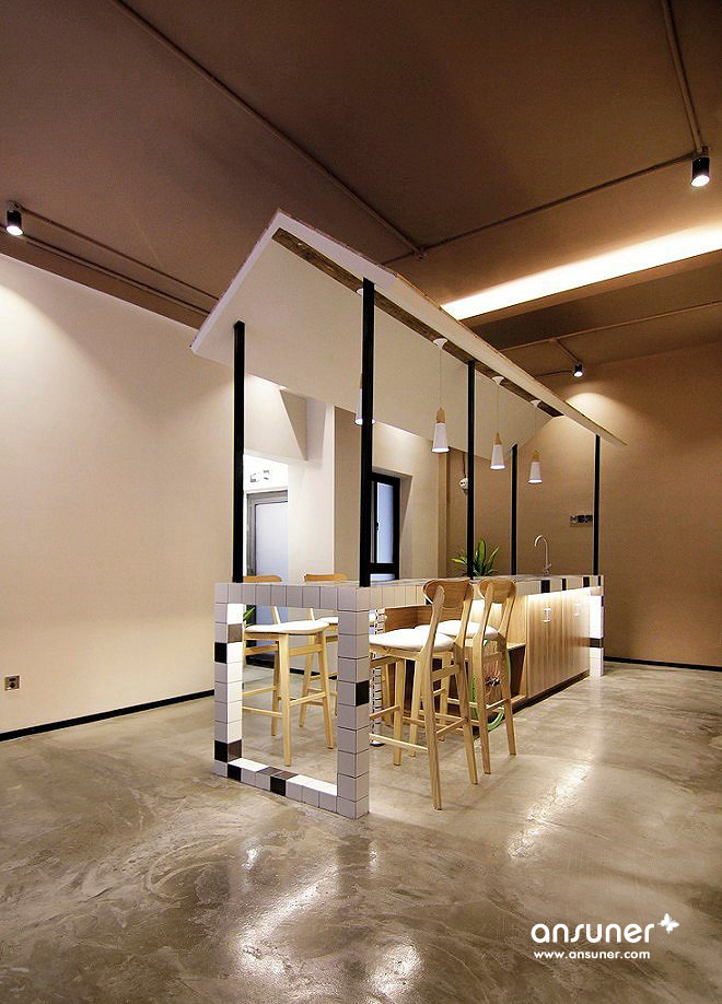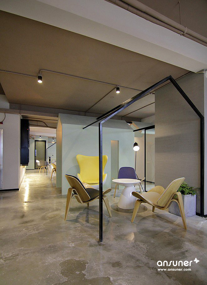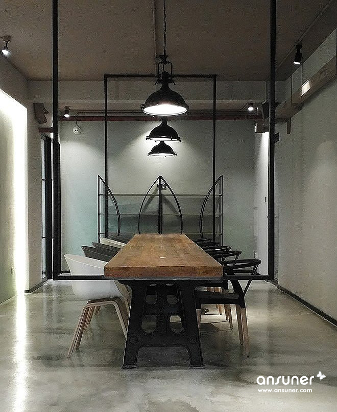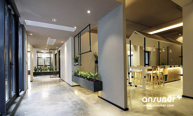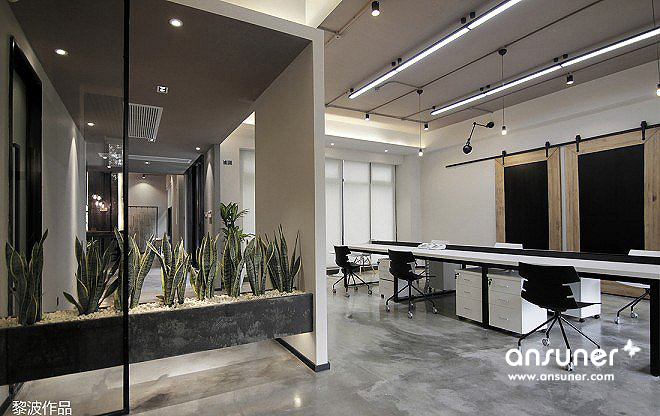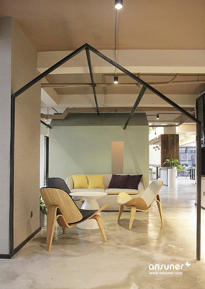 整体呈现出工业的样貌,搭配绿植景观设计,在拘谨与放松之间达成一个舒适的平衡点。