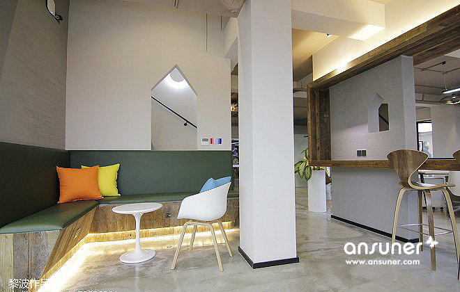 接待台兼办公吧台结合,位于门厅右侧,通过背景灯光的承托,显现出质朴温暖的意境。