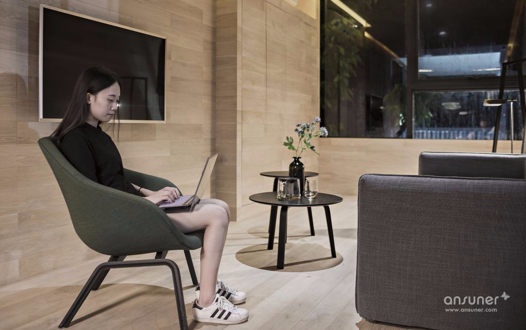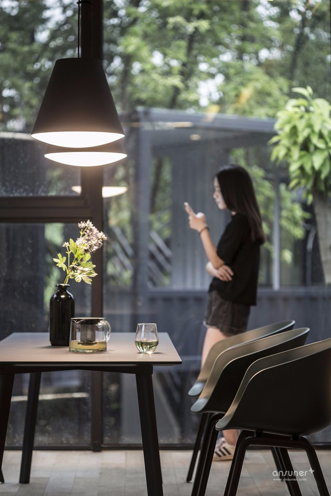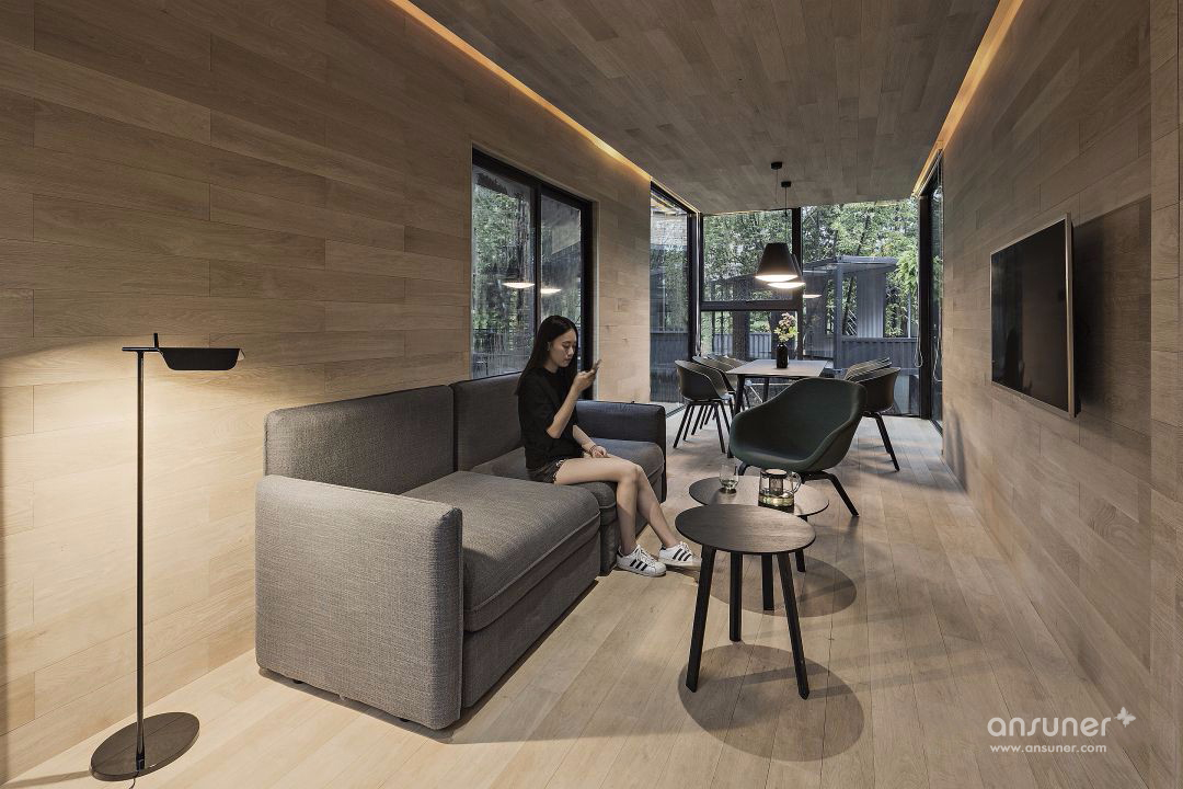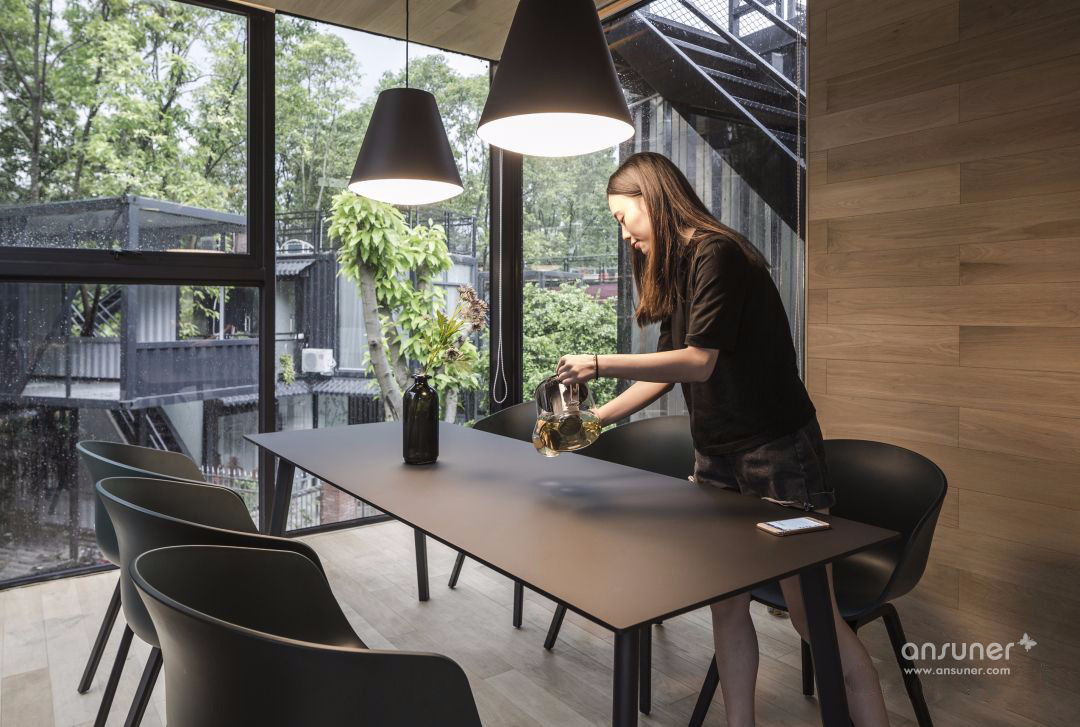 在设计这个项目的时候,除了解决功能上的需求,考虑得更多的是我们怎么去利用好这个空间来形成一种好体验及氛围,不希望最大范围盲目的去进行分割加建,反而希望有草坪、院子、阳光平台等生活空间。可以三五人群一起在楼下院子草坪上的户外桌椅讨论项目,也可以一杯咖啡独自一人在阳光平台躺椅上独自思索。空间,是一个存在的语言。构筑空间,并不是理论上的色彩学与材质学的拼贴,而是如何将人的感受力转化为具体氛围,人在空间里面如何生活、如何工作、如何思想。