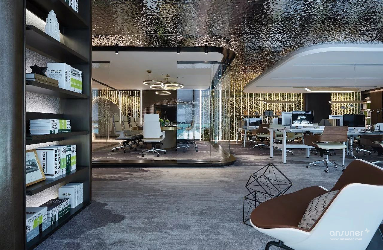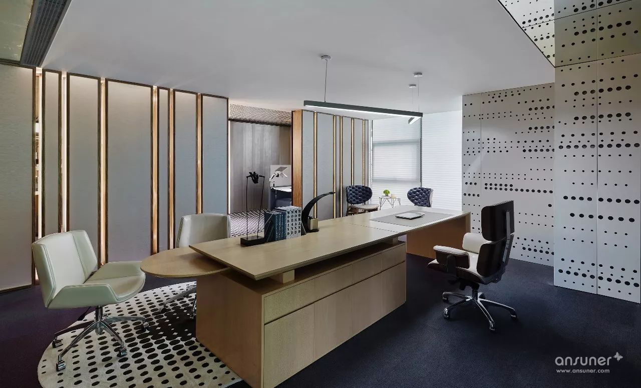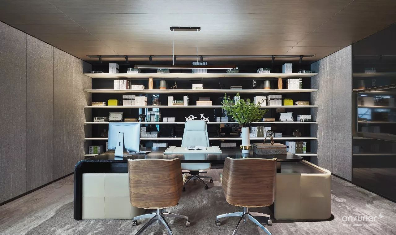 经理室区域独立,让商务洽谈更具私密性。空间运用点线面构成概念,办公区利用书柜分隔,既做到了空间上的划分,又可通过展示柜内陈设呈现个人雅兴,体现个人品位。