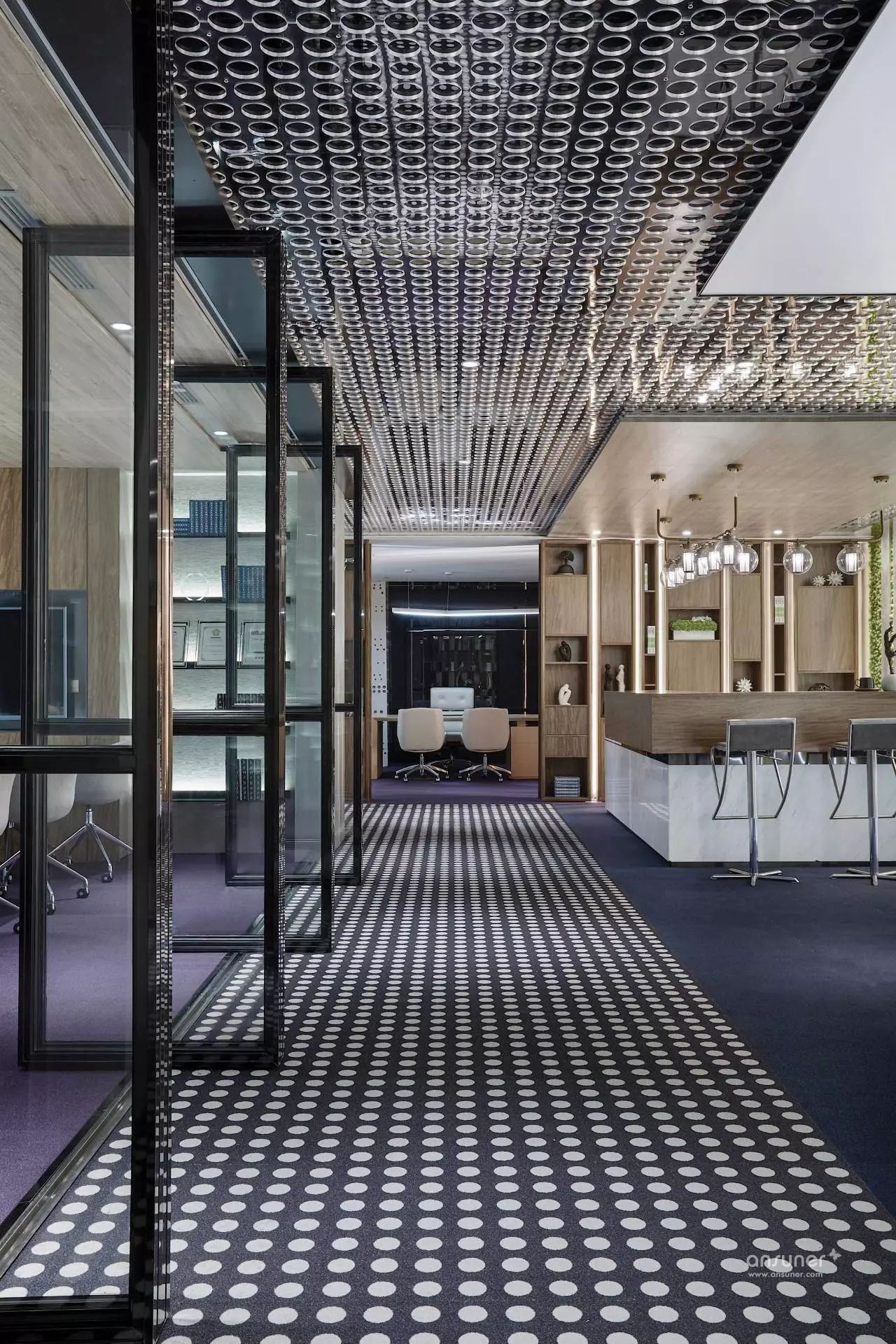 设计师运用石材、金属、木饰面结构穿插的巧妙手法呈现出多功能接待厅、接待台、水吧区的现代感与创新性 。