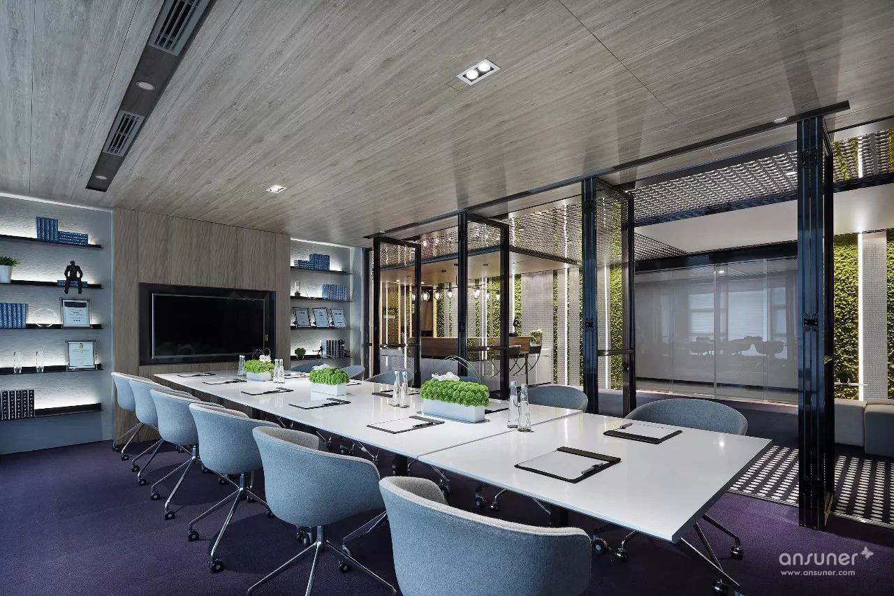 经理室融入会议功能,提高会议效率的同时大大的节约了功能空间。书吧区域可利用休息时间进行充电,让办公更具人性化,气泡式智能会议功能让办公环境更具科技感,设置互动讨论区可随时进行头脑风暴,座位对应墙面配置视频电视可随时转换为会议模式。