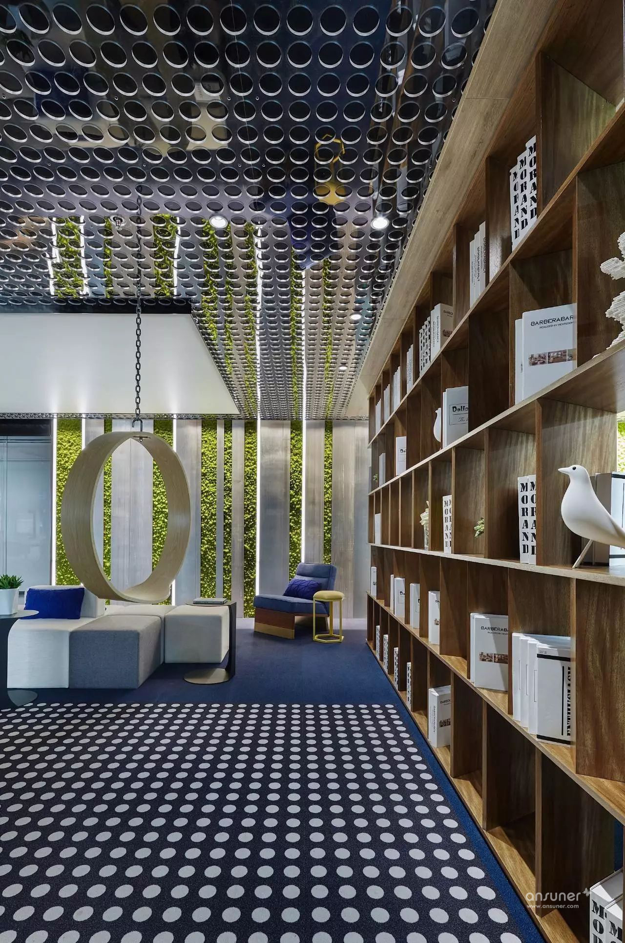 室内设计沿用原建筑设计的“山水城市”概念,配合技术创新,构筑一个都市中的逆世界,天花顶部似水,墙面线型为山,地面像漂浮着的云朵的地毯,融入自然生态美学,打破传统室内空间的固有形态,营造逆空间的独特视觉效果。