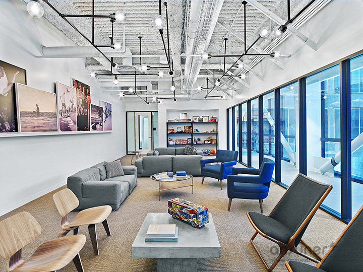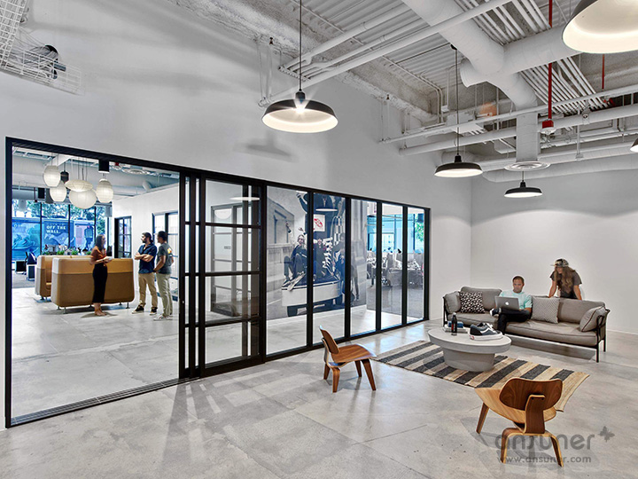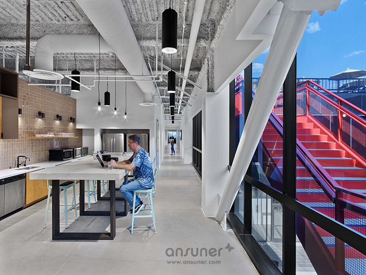 室内特别设计成混凝土水泥地面,鼓励大家踩着滑板在工作区之间自由穿梭。以开放式协作型设计理念塑造的工作环境,培养和促进积极的工作方式、以及协作和创新的工作文化。