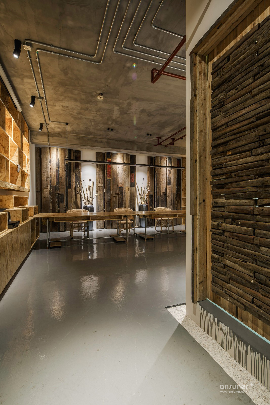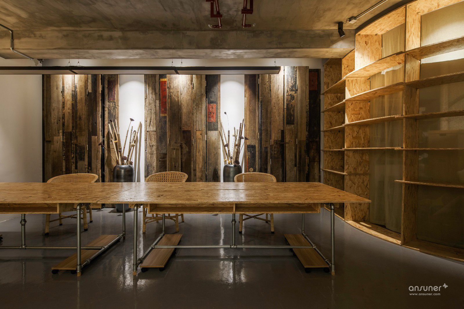 四扇落地窗将光线引入昏暗的走廊,竖向的线帘与横向的竹帘,细腻的思维和粗旷的手法,创造的重组与视觉冲击,最终达成和谐。进门后映入眼帘的老门板,从北京到长沙,传承了百年的文化经典。老门板余料拼成粗犷遒劲的木门;柔美雅致的流线型高柜,巧妙的围合出储物空间;设计师手工打造的办公桌纯粹且新颖。不寻常的空间让员工仿佛置身于老街古巷,使后现代风格也透露出历史的温暖,满足了人们在其中一切关于过去的美好幻想。