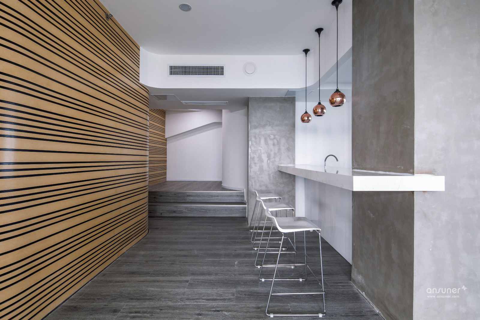 步入公司大门整个前台区以一种不规则的形态呈现在你的眼前,远角处经由一个廊口连接一层办公区域,设计师的故意为之让办公区不但具备很好的私密性,同时也保证了整个办公区不受外界干扰。沿着墙面蜿蜒的线条走进去,瞬间感觉豁然开朗,访客则会产生“别有洞天”的感受。楼梯间与公司唯一的8人员工区一起被放置在靠近窗户一侧,设计师还刻意保留了隔层的原始结构,以拉升空间高度,使公共办公区域得到有效增容,这样一来无论是在办公室里面还是员工区,都能轻松一览窗外美景。另外设计保留所有主体立柱以清水混凝土的外表体现,一丝工业风也油然而生。