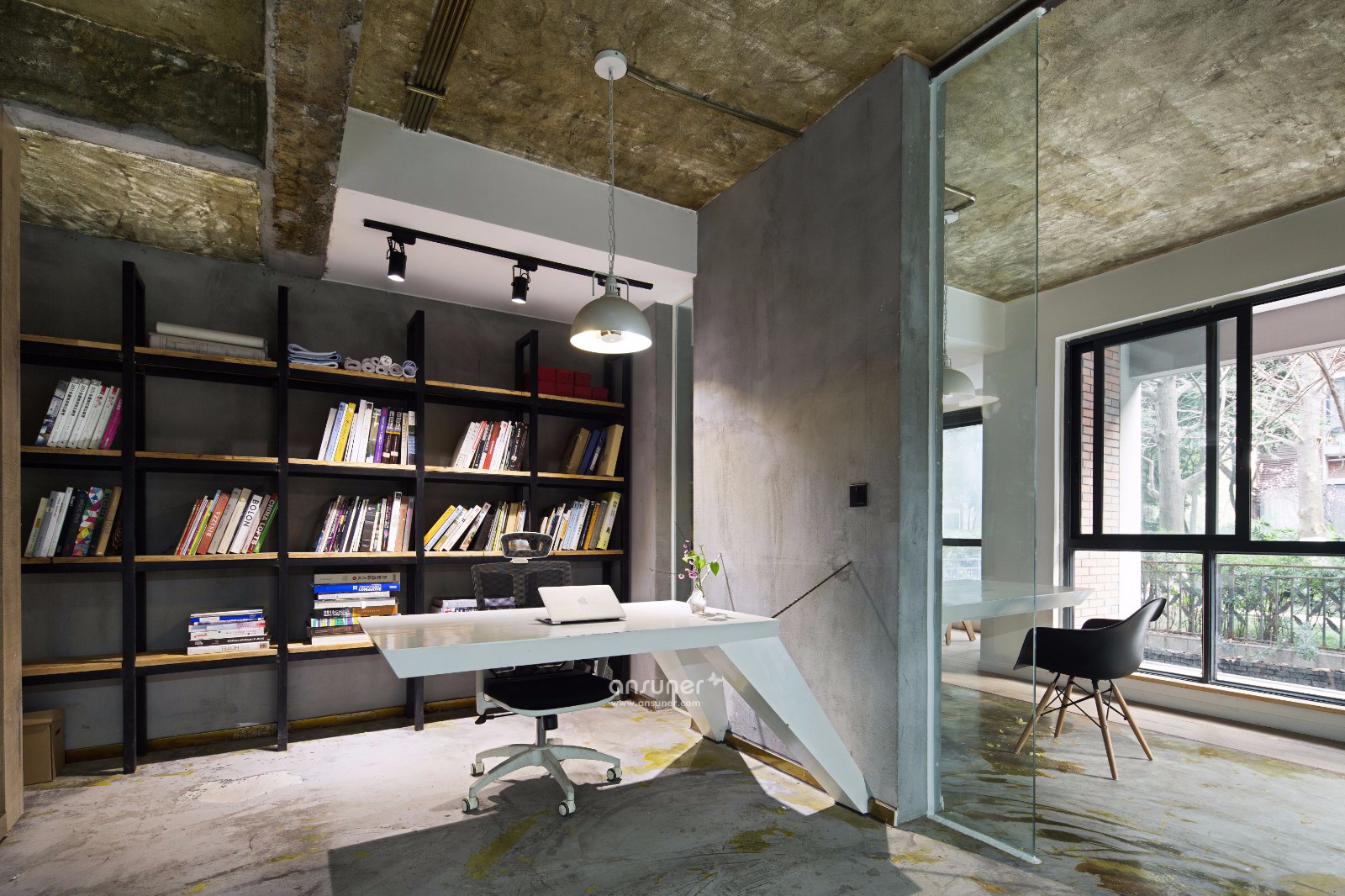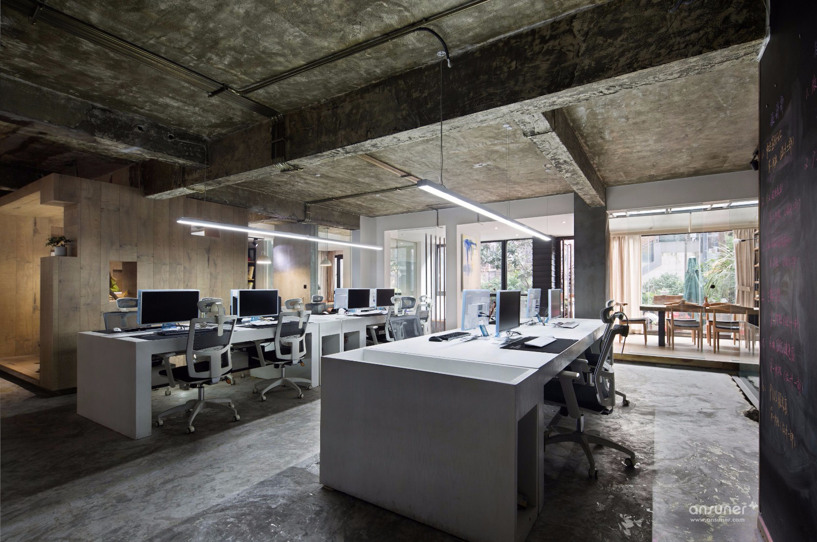 办公空间一共分为上下两层,上层是日常的办公空间,所有墙面的色泽深浅变化与印压痕迹,打造出新旧交融的后现代风格空间,独具粗犷的美感,。办公桌椅及办公用具皆采用白色,与空间色调搭配既和谐又现代。场地对角线处隔出一个玻璃空间和木框空间,采用半隔断的方式使空间的划分自由度很高,平常可用于简单的会议和会客,通透的玻璃天花板让采光变的更通透,再配以随时开合的玄色卷帘,显得极为体贴温馨。