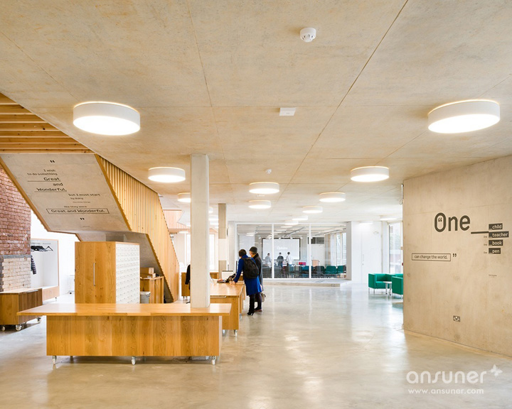 在入口处,由激光切割制作的The Foundry标志贴在混凝土墙面上,移动玻璃门上贴着由山墙建筑演变而成的蓝色造型标注着“进”与“出”的标识。室内的房间编号采用同样的激光切割工艺直接贴在门板上,房门上的公司名称则是可以随时撤换的。窗框的表现形式以重复间隔的木制竖条加以修饰,与室内的楼梯造型遥相呼应。室内空间表现出服务的主题:关注人权。以世界历史从古至今影响深远的思想家与人权领导者的名句构成一个整体的空间故事,并将文字与人物以艺术的手法构筑整个空间氛围,以此映射本案独特的文化思潮。户外楼梯间的透明墙体上装饰着醒目的黑色金属文字,昭告着人们此处的属性。以著名人物马丁路德金、昂山素姬、曼德拉和亚伯拉罕林肯等一系列超大肖像图形,装饰于一楼的会议室玻璃窗上。每个肖像均以其所说的言论以文字图形塑造。