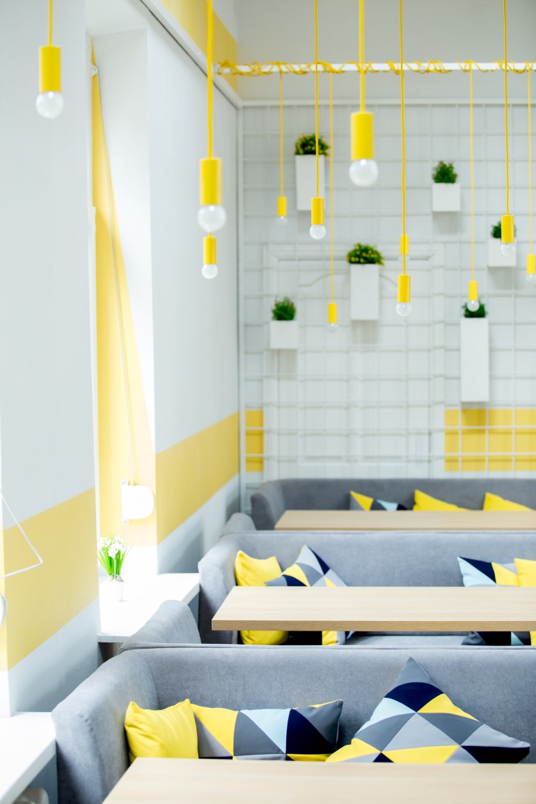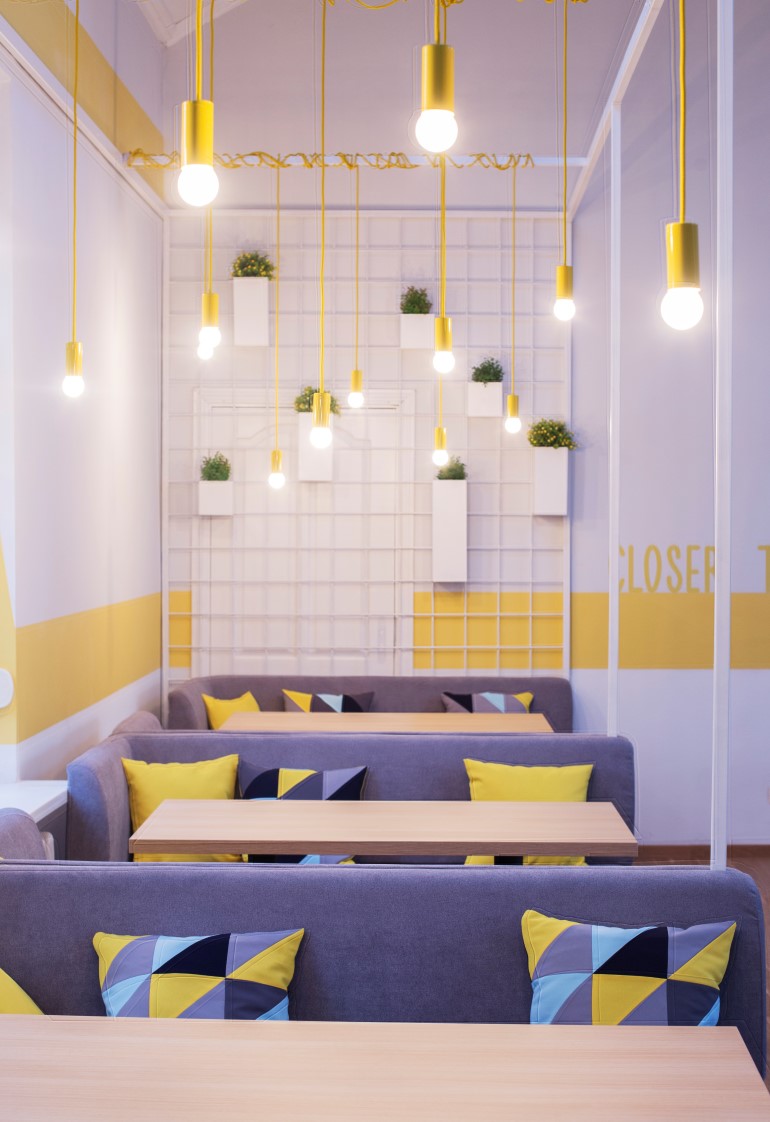 室内的色彩方案包括:白、灰、蓝和黄色。温暖的“阳光”设计概念通过墙面的人工光照与色彩的创意表达、以及顶面天窗射入的自然光照,共同烘托设计主题。