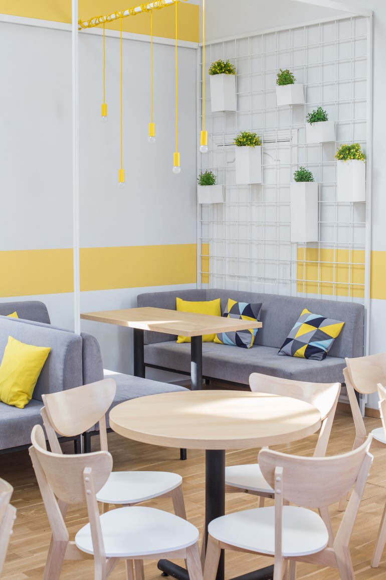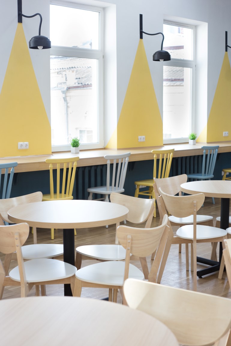 室内的中心以小圆桌的形式提供自由的工作方式。小圆桌配以可爱的小木椅,可以随意自由组合,这里既可以稍事休息、也可以团队交流协作。同时也为在这里的联合办公人员提供咖啡、娱乐和派对活动等。