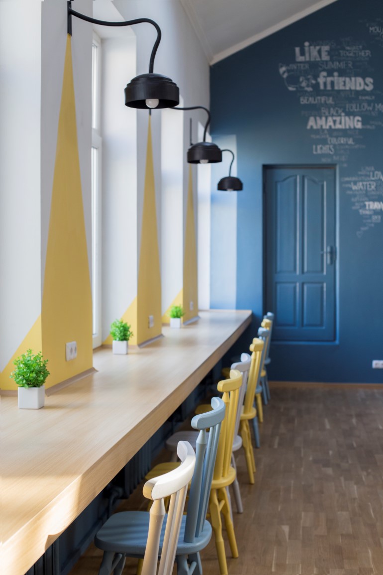在前门附近,为管理者设置了两处办公区,并为到访的客户设计了一组漂亮的组合坐凳。前台后侧靠左边的地方,设计了一排背靠背沙发座工作区。金属框架的沙发除了耐久实用,还让人有安全感和舒适的体验。顶面垂下的灯具与沙发靠垫色彩形成呼应,为简约的空间带来精彩的创意效果。沙发座的尽头有一扇门(功能需求不能拆除),因此采用巧妙的小设计将其隐藏。沙发座靠近入口的那一端,用金属管设计了一组装饰柜,即具装饰性也为管理人员提供储物的功能。