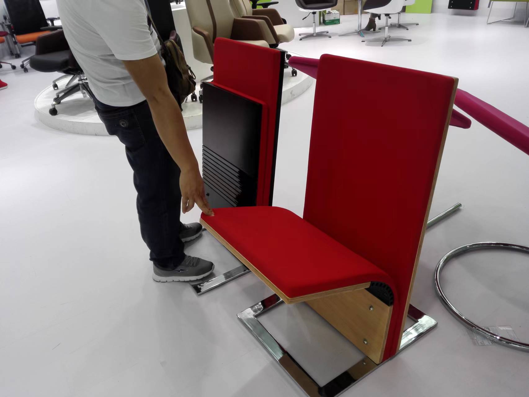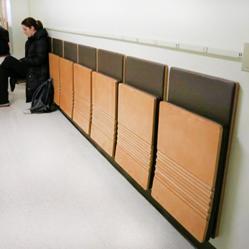 1.座、背海绵:座绵内含钢制框架和S型高弹力弹簧一体发泡成型,座绵密度为50kg/m3,背绵密度为50kg/m3,外形根据人机工程学人体曲线设计,框架采用优质钢板冲压焊接组合成型。 2.座、背板:经专业设计,采用优质18mm厚多层板面贴防火板经模具压弯成型,外型成弯曲弧形,美观大方。 3、站脚:采用80*8加强型底脚板,使用的所有钢材均为国标产品,金属件金部采用静电均匀喷粉,喷粉前进行完整的除油、除锈,酸洗磷化处理,表面采用漆粉工艺,并经高温固化处理。 4.面料:座、背采用高级定制的弹性布料,耐磨、防褪色,手感舒适,长时使用无皱,无断裂、不起球。.颜色可自选。 5. 回位功能:采用轴承复合记忆钢回复机构,顺畅无障碍。 6、产品特色:节约空间,能在行距800的台阶上安装。能适应于许多不同的公共场所,可固定在墙上,也可以固定在地面。