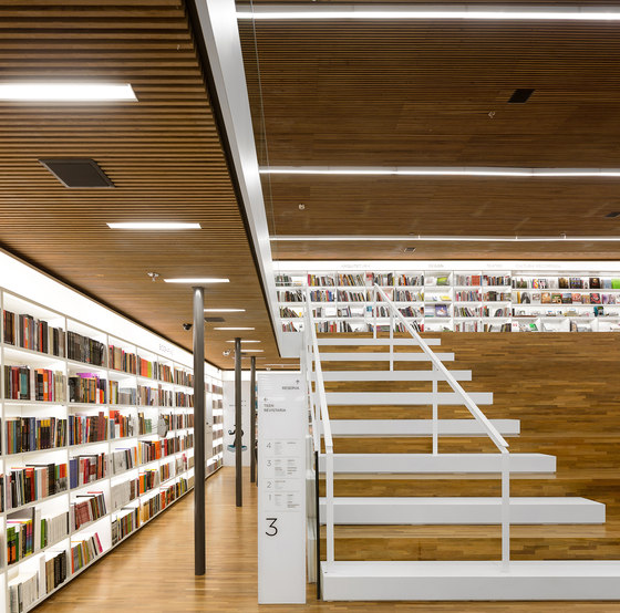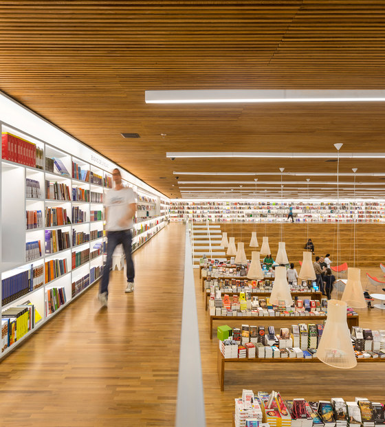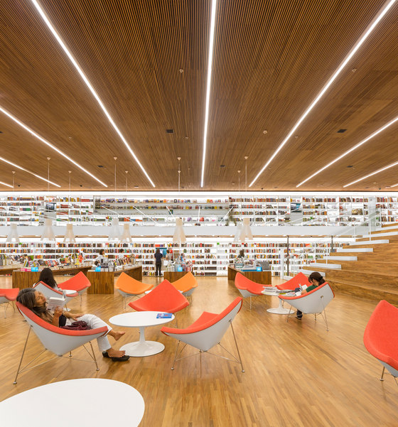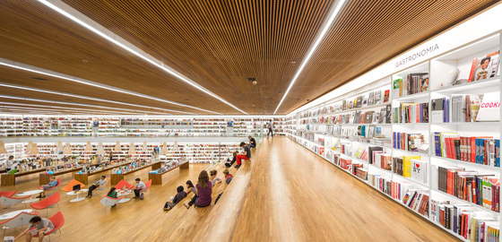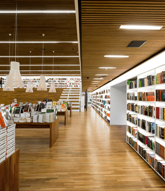 Uma livraria como um espaço de encontro. Foi essa a principal premissa do projeto arquitetônico da Livraria Cultura do Iguatemi. Mais do que apenas um lugar de compras, a loja é convidativa para a permanência e convivência. Assim buscamos que os visitantes não apenas entrem na livraria, mas fiquem por lá. A entrada é feita por uma porta de 7,7m, na qual os caixilhos de alumínio e vidro são inteiramente recolhidos, deixando a passagem livre. Nesse piso, com dimensões mais intimistas, estão os produtos audiovisuais, como CDs e Blue Rays, e um café no jardim. Um jogo de escadas rolantes leva até o grande vão da livraria, perpassando um andar intermediário, que tem brinquedos e histórias em quadrinhos – o chamado Espaço Geek. Chega-se então ao andar superior onde há um grande salão, com poltronas e mesas, além de uma arquibancada de 21 metros de largura aberta para todo o vão. Convidativa para folhar um livro ou mesmo para abrigar pequenos concertos e palestras, essa estrutura conduz os visitantes para o mezanino aberto. Os livros envolvem o lugar, apoiados em onze grandes mesas dispostas ortogonalmente no salão e em estantes brancas na periferia. Essas prateleiras tem iluminação de led embutidas e formalizam a delimitação do espaço, como em cubo revestido internamente por livros. Uma sala multiuso, especialmente para conferências – que ganhou o nome de café filosófico –, uma sala para livros infantis e um jardim para crianças, completam o programa. O piso e o forro, assim como as mesas de display, são de madeira. Já os demais planos usam laminados brancos e distinguem as paredes laterais do resto. Guarda corpos de vidro minimizam a interferência visual desses elementos no espaço, desaparecendo no conjunto. A iluminação é feita por linhas de luminárias e completadas por pendentes no centro do salão superior. A configuração da planta da livraria, especialmente por meio de uma circulação aberta buscou a fluidez e continuidade espacial. O percurso arquitetônico se inicia em um espaço acolhedor, até chegar a um lugar monumental, vivo, onde ficam a maioria dos produtos e onde os visitantes podem interagir uns com outros, onde podem pegar um livro e ler um capítulo antes da compra, onde podem simplesmente descansar olhando o movimento. Pensamos que assim, como espaços convidativos e agradáveis que acabam por propiciar a sociabilização entre pessoas, são as livrarias no século XXI. O programa é a própria vivência da loja.
