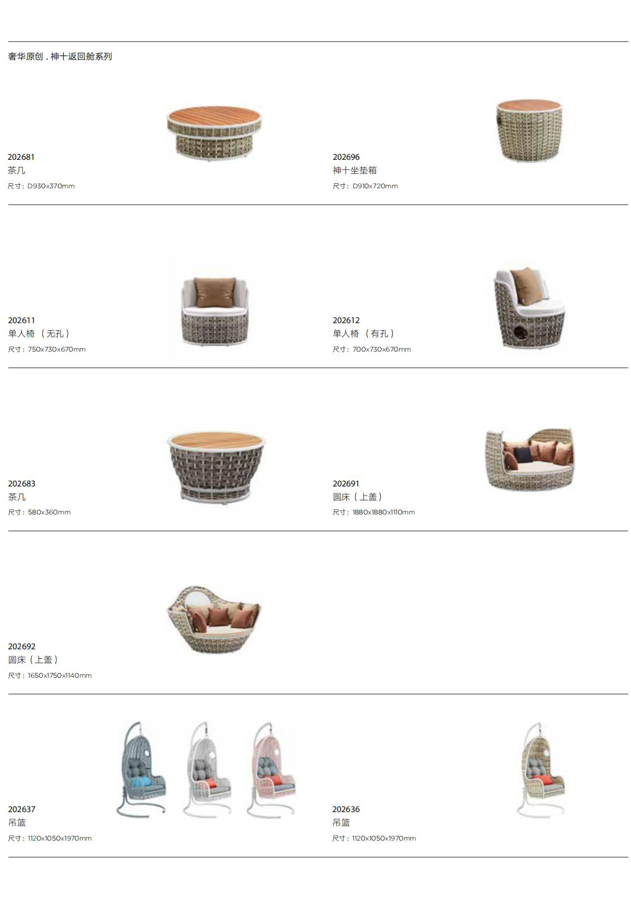 设计灵感:神舟十号宇宙飞船返回舱 “变”---顶盖拆分后可变为圆弧形的茶几,上盖展开后可以成为一张单独的沙发床,而一旁的脚凳收纳后即成为上盖坐垫,整个产品摇身一变为两个沙发床套件 “多”---配有21个舒适坐背垫(10个大,11个小),可以无忧舒适地躺仰在每个角落 “大”---座高36cm, 依照人体功能学设计,整体设计宽敞,可以容纳一家三口 “柔”---柔软的环保PE藤编制让原本硬朗的神十返回舱,多了一份柔情 整体造型让人联想到伟大的中国宇宙飞船,创造舒适的户外生活空间。暴露的内部铝结构提供了一个给用户安全感,也创造出与众不同的视觉美感。 重型铝框架提供了一个强大和安全的结构,坚固的高优质编织柳条,让用户更充分地信任最终产品。能够堆叠成完整的单元,使结构具有吸引力,当不使用时,还能更方便地储存。 该系列提供了一个完整的套房,以满足每一个户外放松需求。从睡觉到吃饭到荡秋千,齐全的设备,充分改善户外生活环境,给用户更多享受。 该套装可作为单张封闭式的日床使用,也能分开变成两个开放的沙发,与单独的咖啡桌和小躺椅。独特的可堆叠的设计,能最大化利用空间,即使不用时,也不占位置,且方便运输储存。